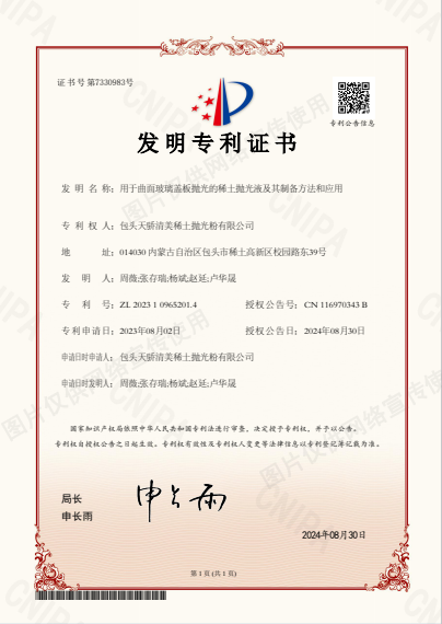 近日,天骄清美申请的“用于曲面玻璃盖板抛光的稀土开云体云app登录入口及其制备方法和应用”,顺利通过国家知识产权局审查并获得国家发明专利授权(专利号ZL202310965201.4)。这是今年继起草两项稀土抛光粉行业标准正式实施以来,天骄清美在稀土抛光材料领域实现的又一突破。
