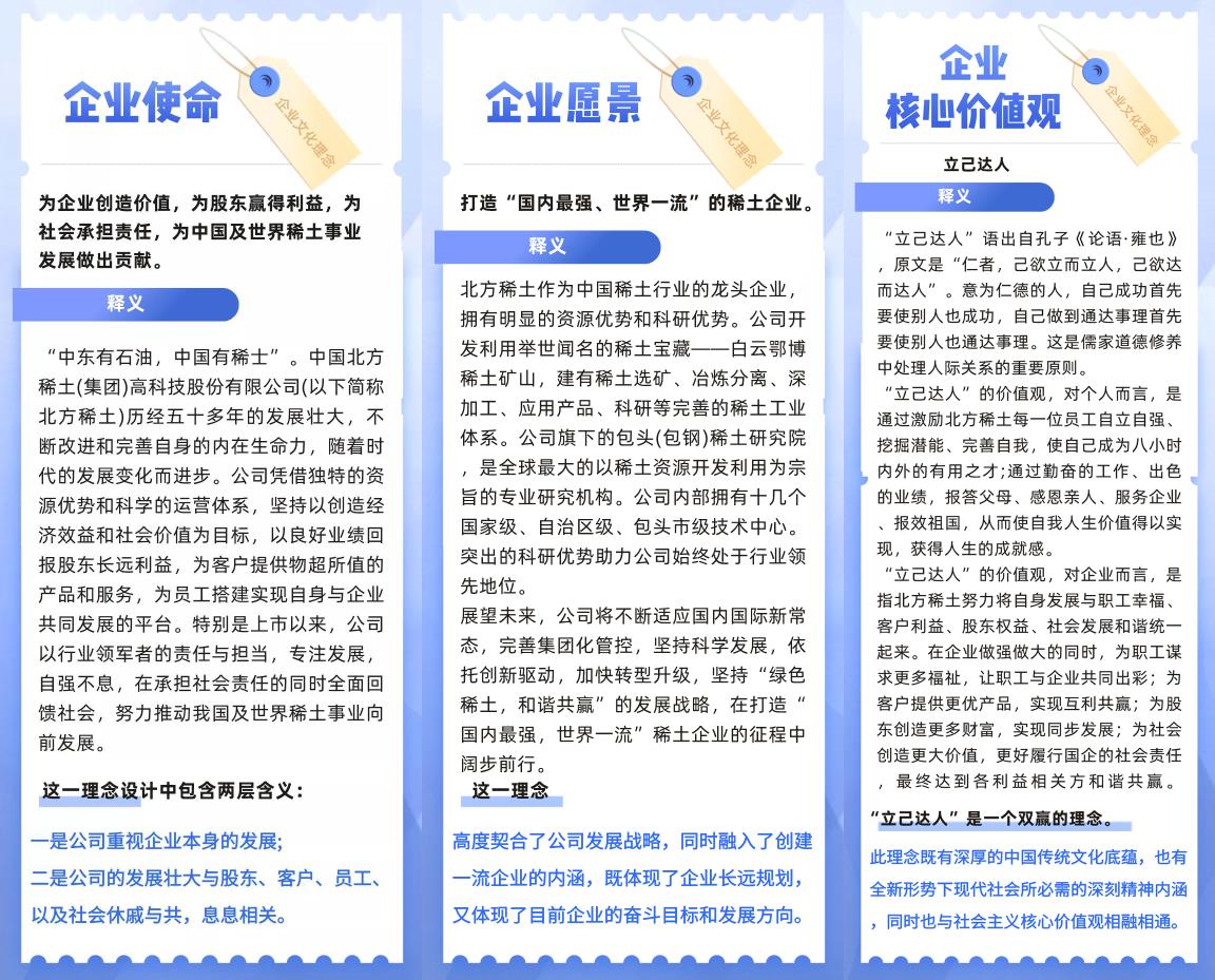 包钢(集团)公司在5 月份开展了第七次“企业文化宣传活动月”。天骄清美公司以此次“企业文化宣传活动月”为契机,通过微信公众号开展北方稀土企业文化理念宣传活动,旨在进一步加强企业文化建设,持续弘扬包钢精神,提高职工归属感,加深职工对企业文化的了解,推动公司企业文化落地,不断增强企业核心竞争力!
